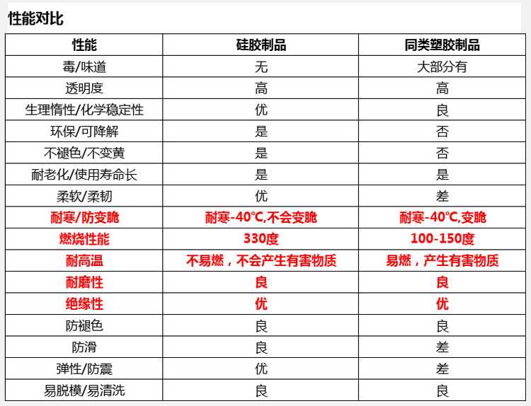 硅橡膠是眾多的合成橡膠中的佼佼者,具有無味無毒、不怕高溫和抵御嚴寒的特點,在300℃和-40℃時,仍保持原有的強度和彈性。